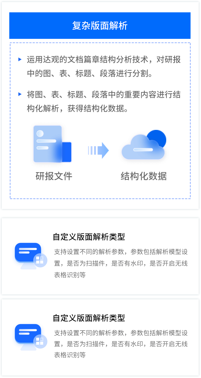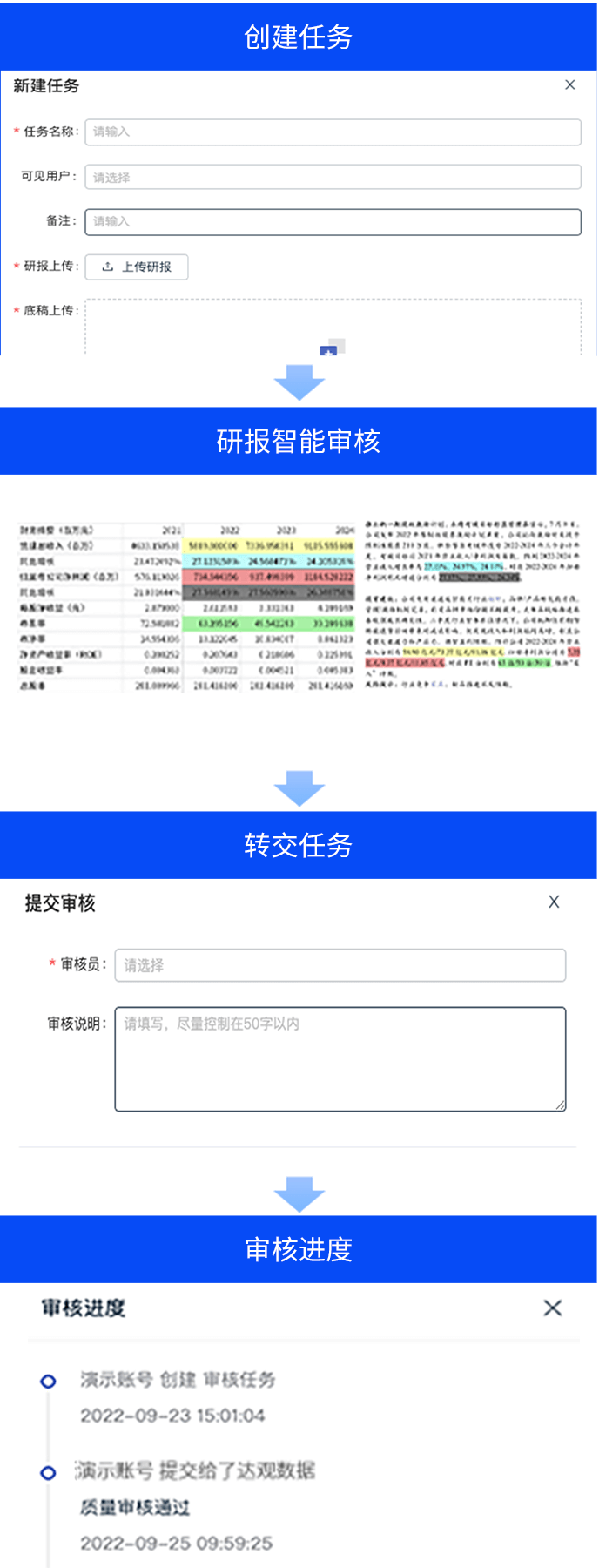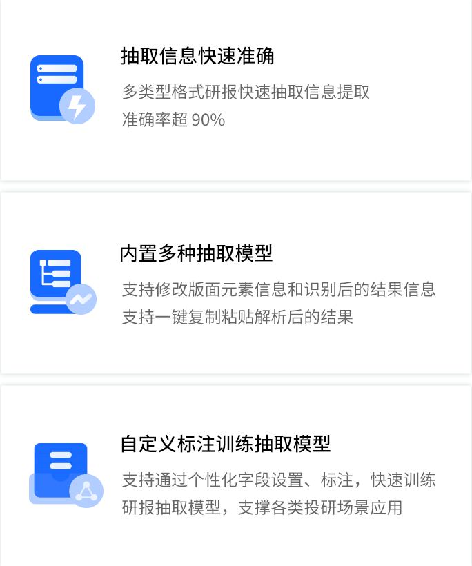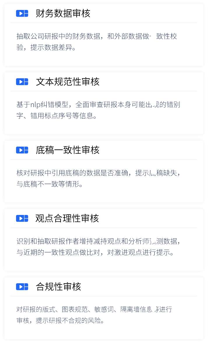 智能研报审核系统是evo视讯官网数据为券商研究所、买方研究组织等用户打造的集研报解析、抽取、审核、管理功能为一体的产品。集成OCR、NLP、机器学习等技术,对研报和底稿信息进行多方面抽取,并对研报进行数据、文本、观点等全方位的自动化审核, 同时对研报和底稿进行规范化、流程化管理,帮助用户提升工作效率,把控研报发布的时效性和合规性,全面降低出错风险。